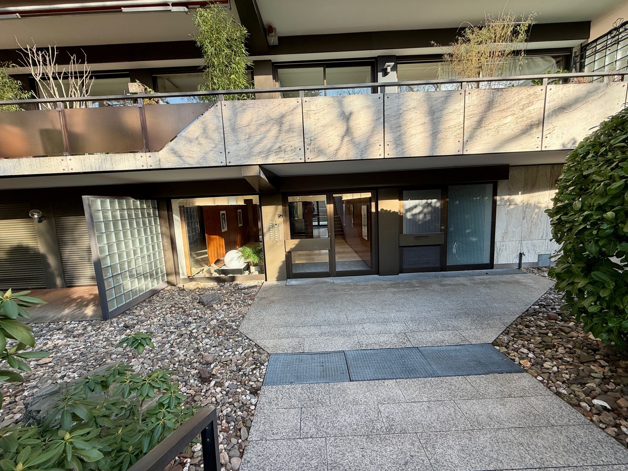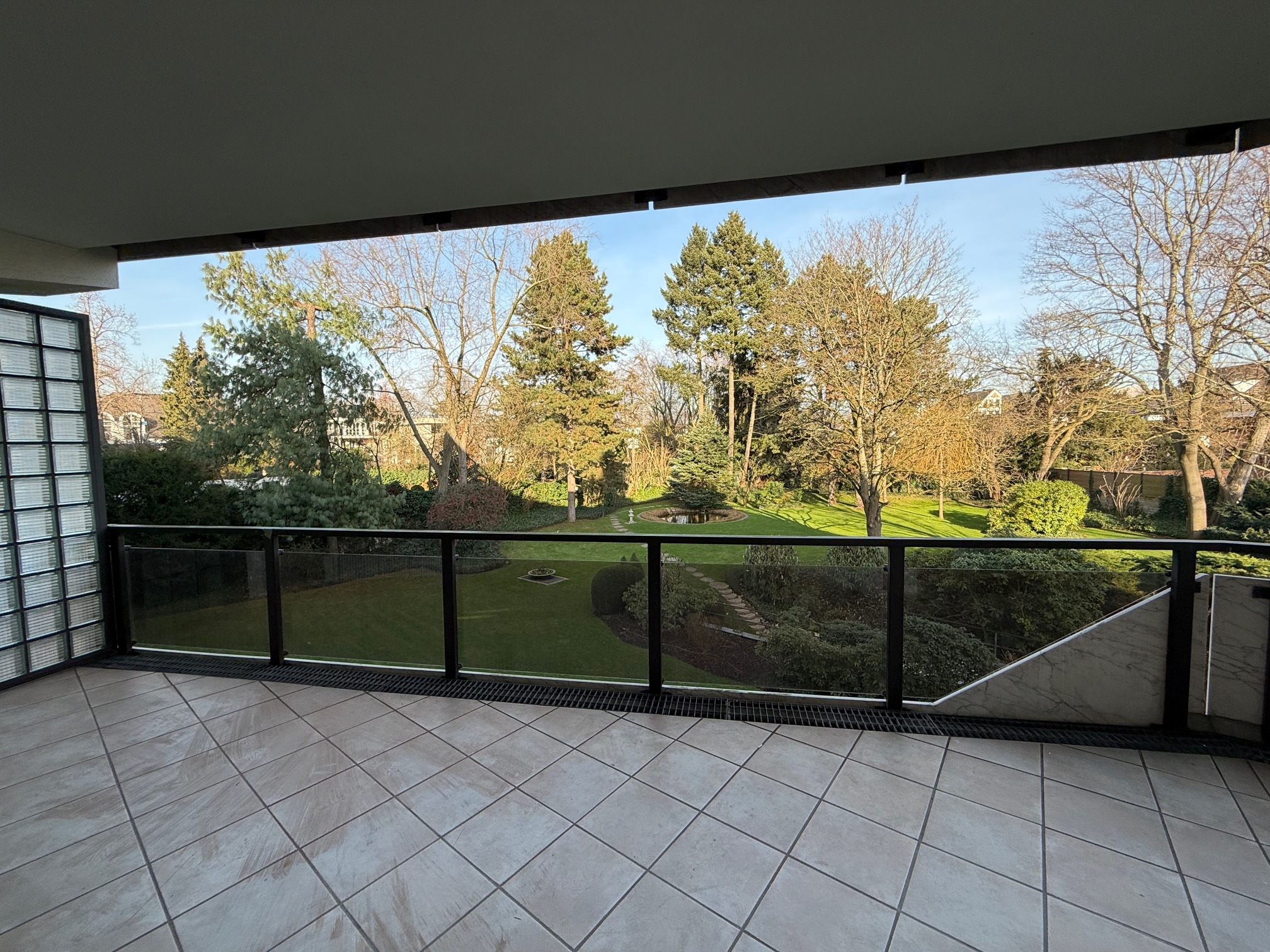 Über eine Tür in der Diele erreichen Sie den privaten Schlaftrakt. Hier befinden sich das Schlafzimmer, ein weiteres Gäste- oder Kinderzimmer sowie das kompakt geschnittene Badezimmer mit großzügiger XXL-Dusche. Beide Schlafräume verfügen ebenfalls über einen direkten Zugang zu einem weiteren Balkon und eröffnen einen wunderschönen Blick in die parkähnlich angelegte Gartenanlage.