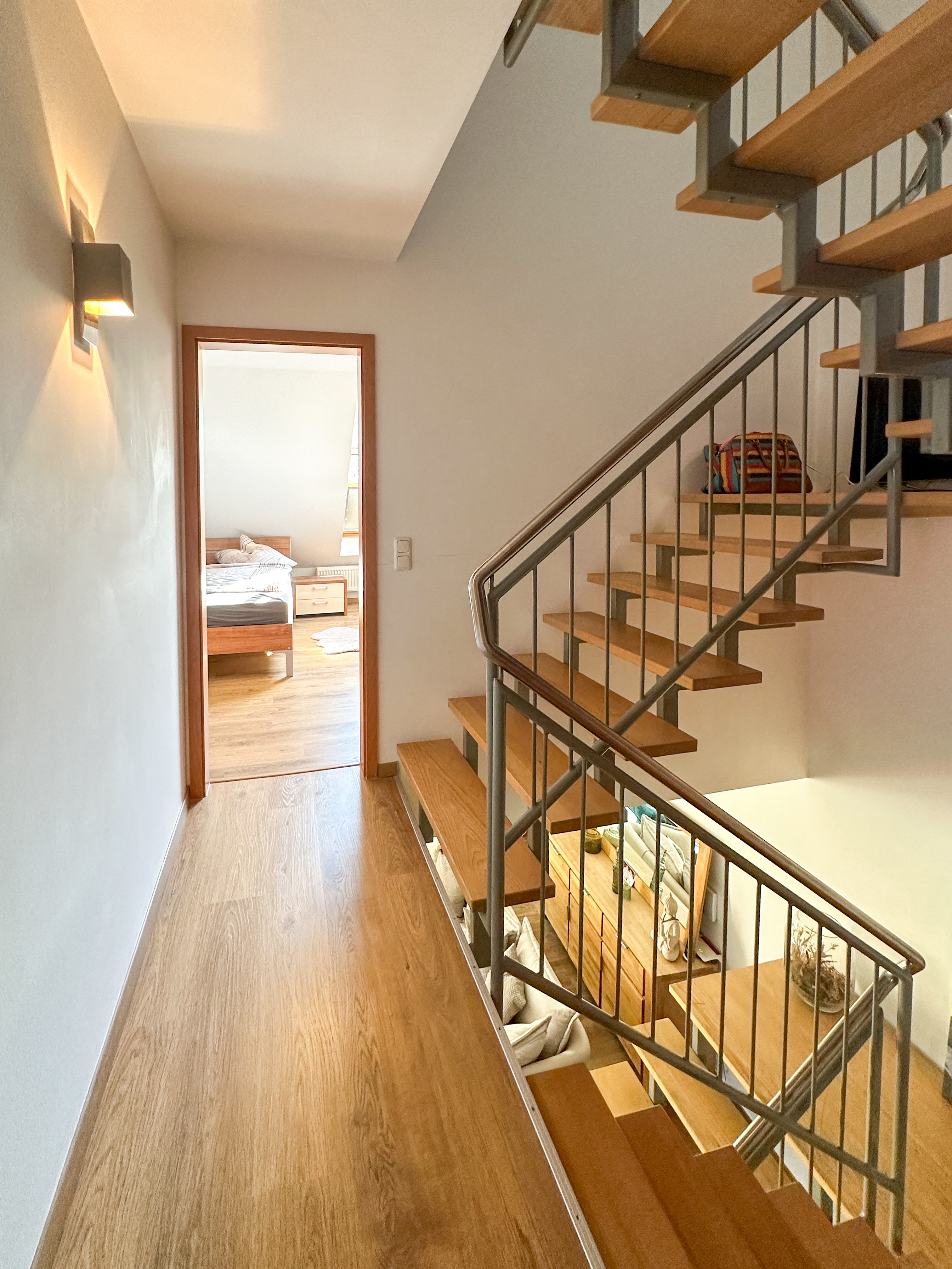 Über die offene Holztreppe gelangen Sie ins Obergeschoss, ein Rückzugsort für die ganze Familie. Zwei helle Schlafzimmer bieten Raum für Ruhe und Geborgenheit. Das stilvolle Badezimmer mit Tageslicht, freistehender Badewanne und Dusche wird schnell zu Ihrem persönlichen Wohlfühlort.