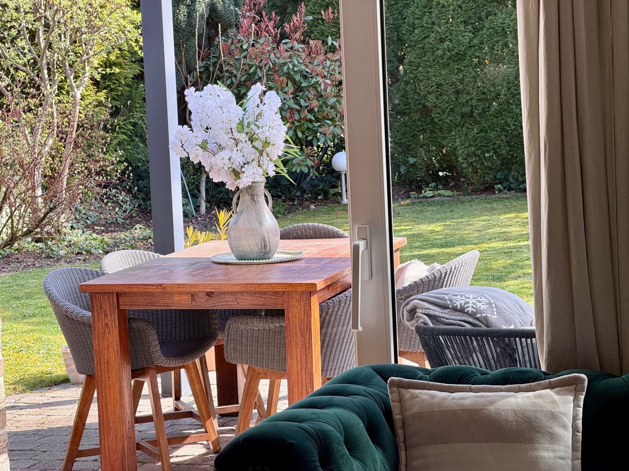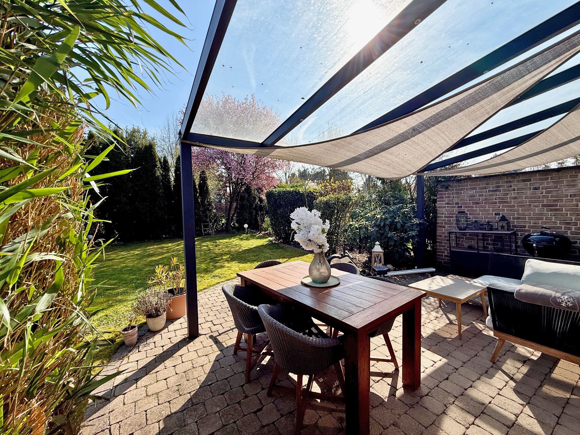 Besonders in den warmen Monaten entfaltet dieses Zuhause seinen ganzen Charme: Die Terrasse mit ihrer Glasüberdachung wird zum erweiterten Wohnzimmer im Freien. Sonnensegel sorgen für angenehmen Schatten, während der pflegeleichte Garten mit gewachsenen Sträuchern Ihnen Privatsphäre und Ruhe schenkt – ein geschützter Raum für entspannte Stunden und gesellige Abende.
