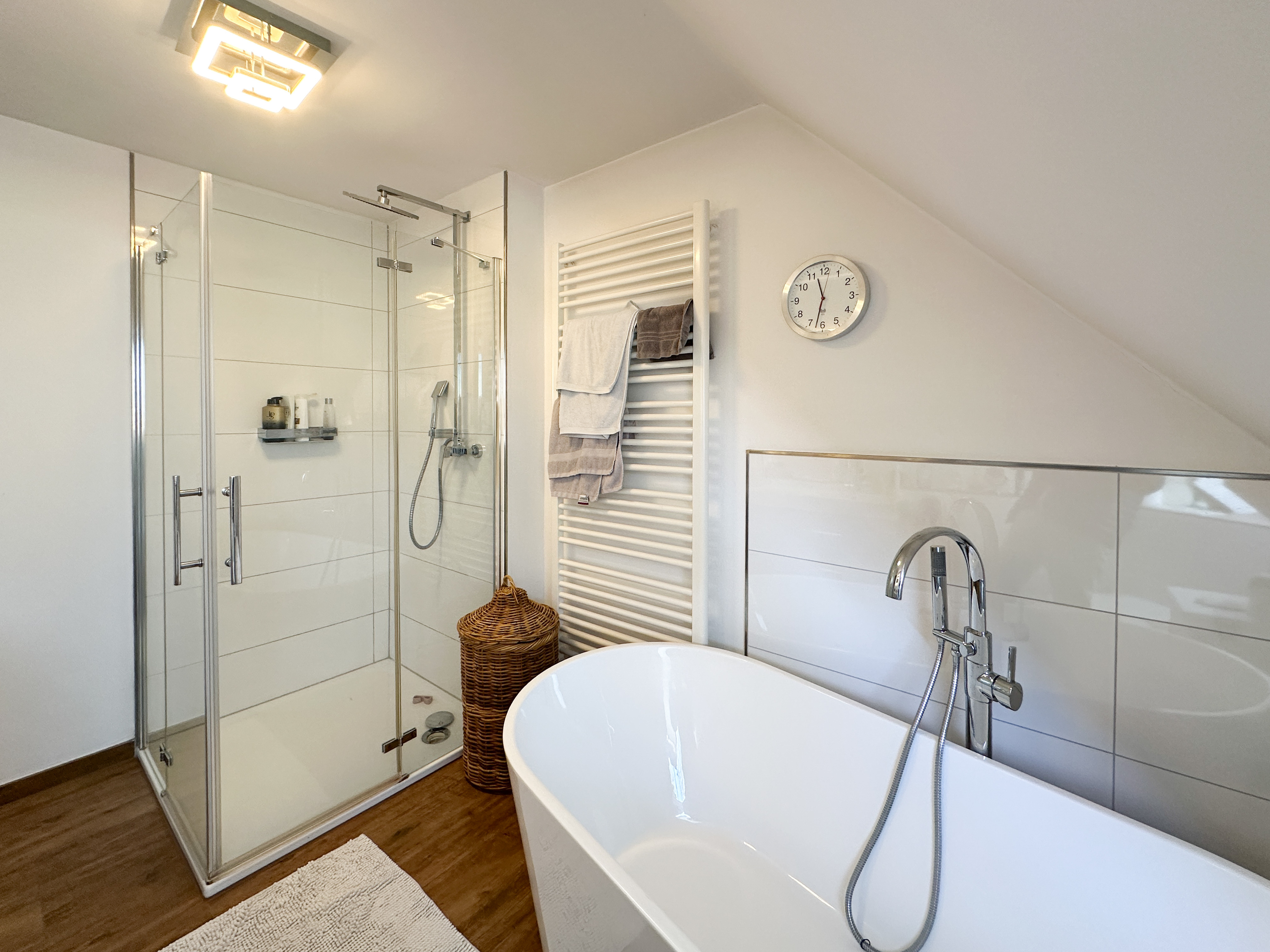 – modernes Badezimmer mit freistehender Badewanne, Dusche und Handtuchheizkörper