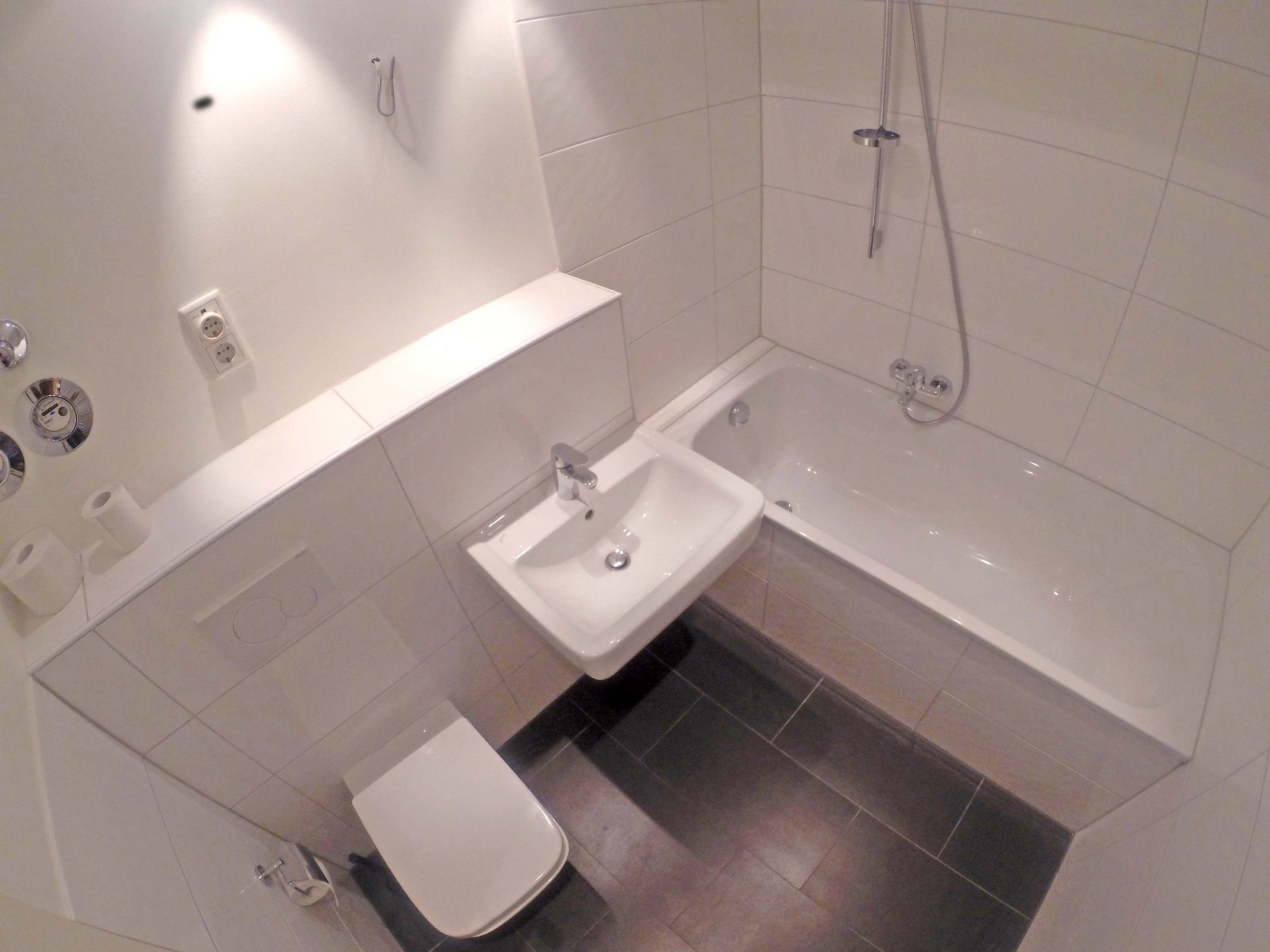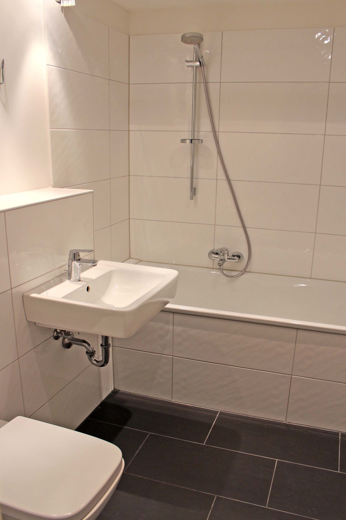 Das bereits modernisierte Badezimmer wurde mit viel Geschmack gestaltet. Weiße Fliesen, helle Sanitärkeramik und ein eleganter, graphitfarbener Boden verleihen dem Raum eine zeitlose, wohltuende Ästhetik.