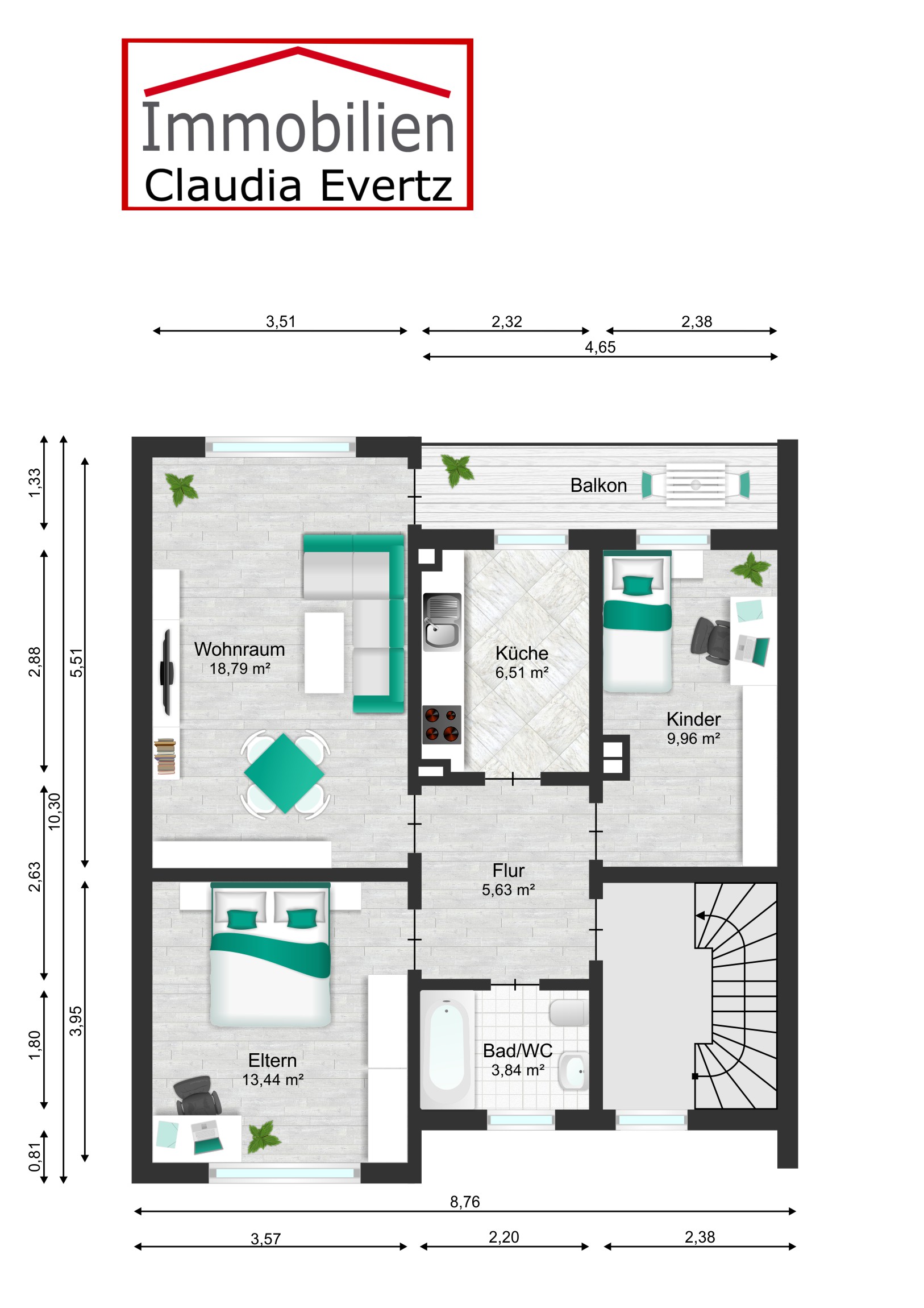Diese seit vielen Jahren zuverlässig vermietete Einheit umfasst drei Zimmer, eine Küche sowie ein Badezimmer. Besonderes Highlight ist der großzügige Balkon mit Blick in den Garten.
