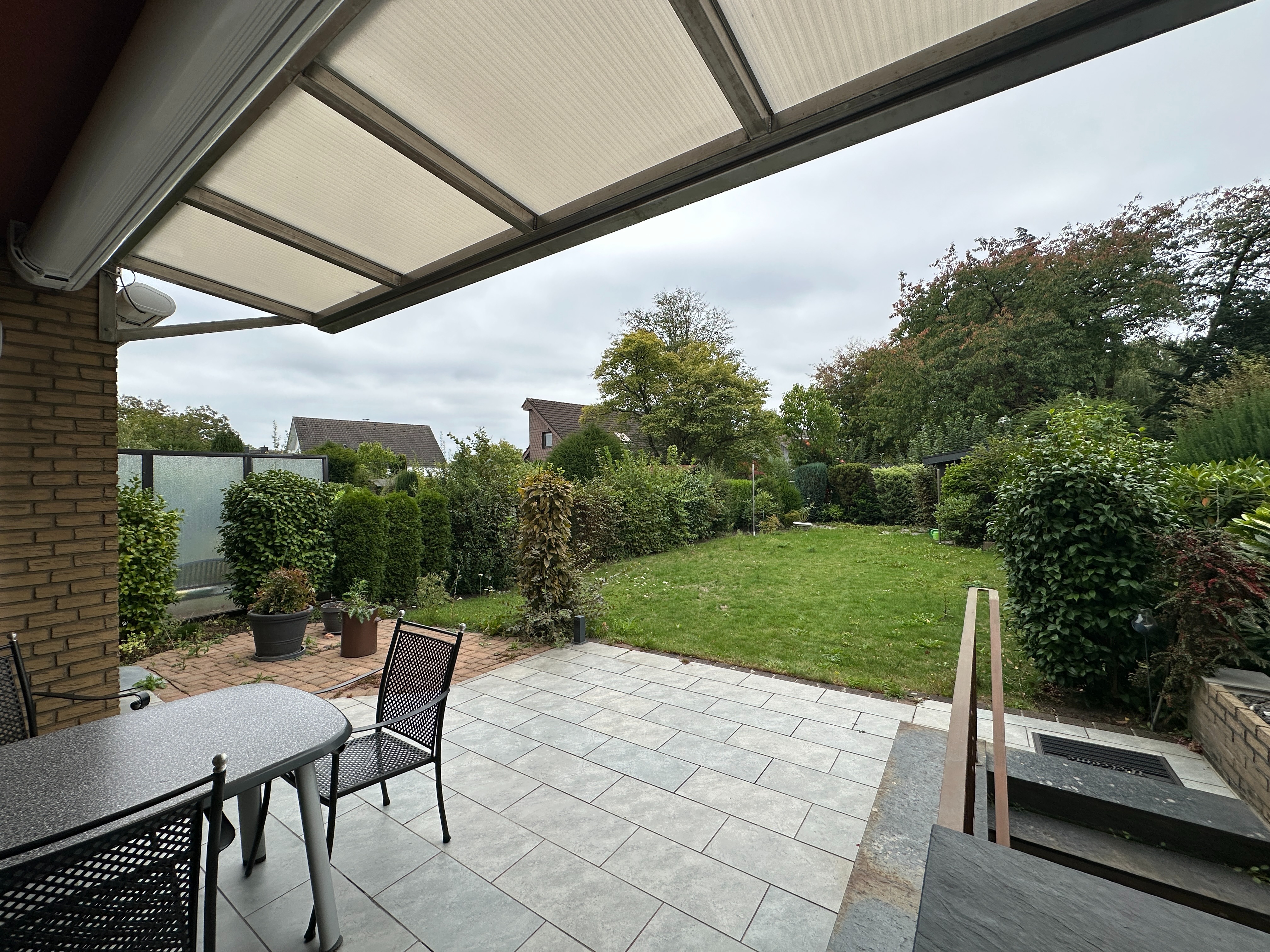 Der Garten lädt zum Verweilen ein; ein Gartenhaus bietet Stauraum und ein Brunnen liefert kostengünstiges Gießwasser.